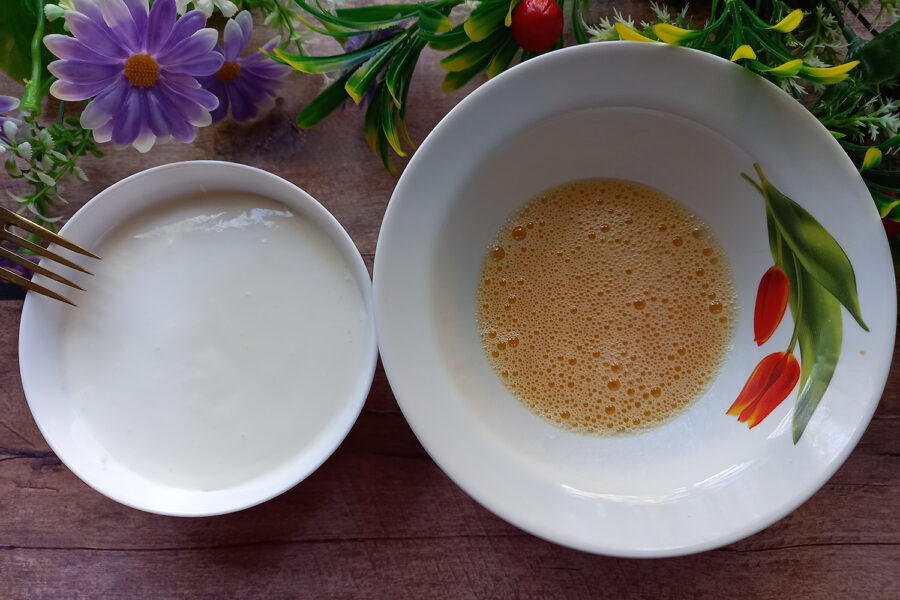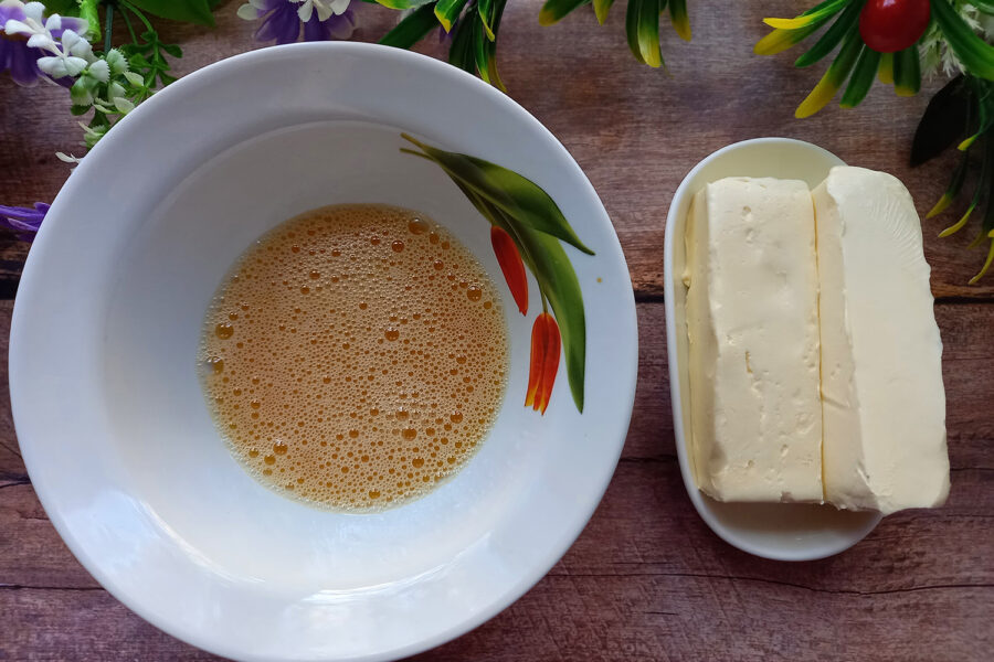 - Adaugati margarina moale la amestecul de oua si amestecati bine. Este convenabil sa faceti acest lucru cu un tel sau o furculita. Un mixer sau blender va ajuta la accelerarea procesului de amestecare. Daca doriti, margarina poate fi topita si racita mai intai si apoi combinata cu restul ingredientelor.