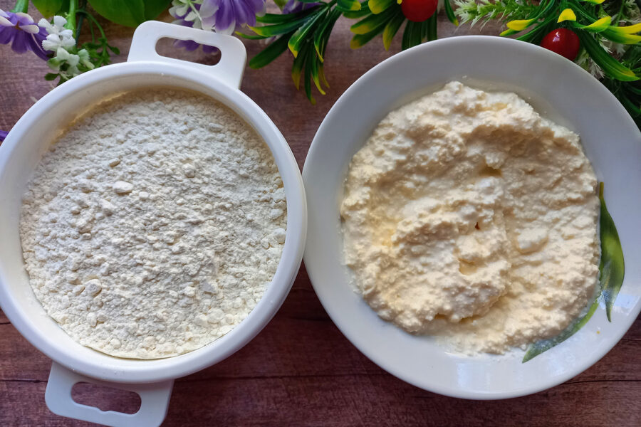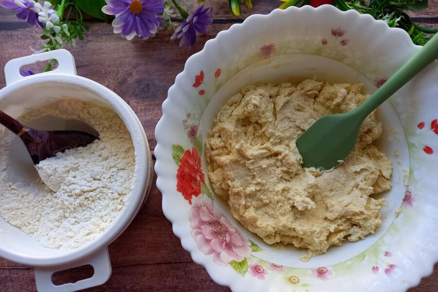 - Pentru a face acest lucru, in compozitie adaugati o cantitate mica de faina folosind o spatula (furculita sau lingura), apoi puneti totul pe masa si continuati sa framantati cu mainile. Ca rezultat, aluatul trebuie sa fie moale, dar nu lipicios.