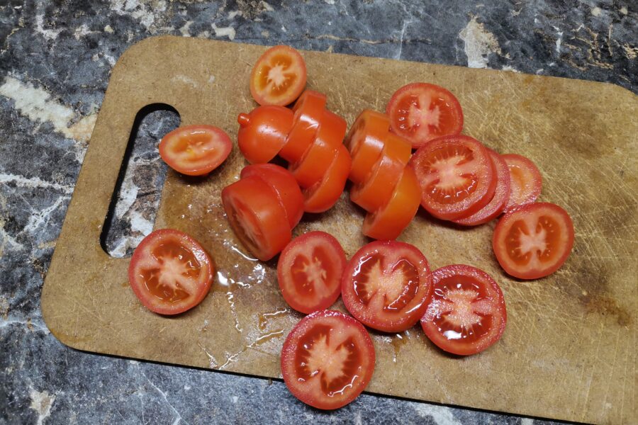 - Se taie rosiile in rondele de 5-6 mm. Numarul straturilor de rosii trebuie sa fie identic cu numarul rondelelor de vinete. Incercati sa le alegeti astfel incat sa fie aproximativ de aceeasi dimensiune.