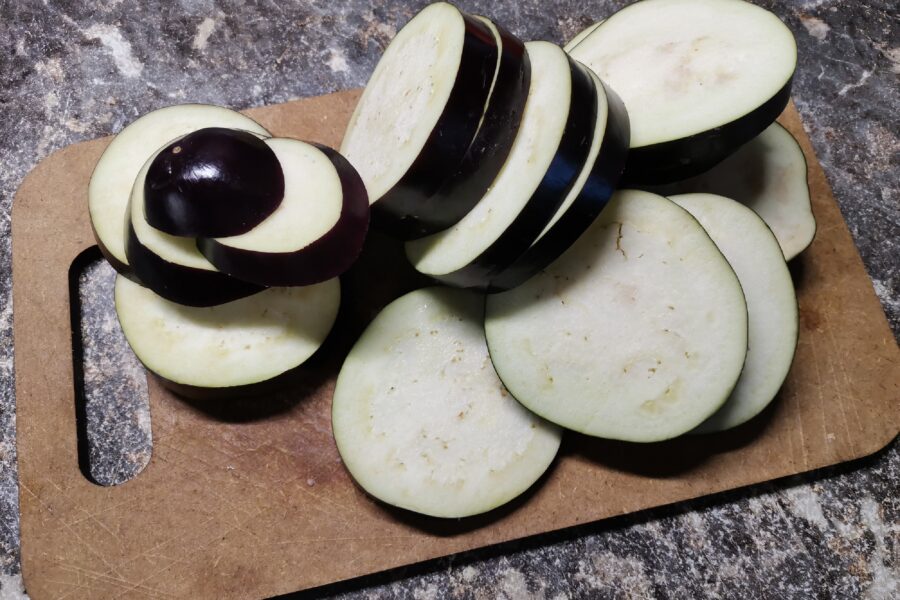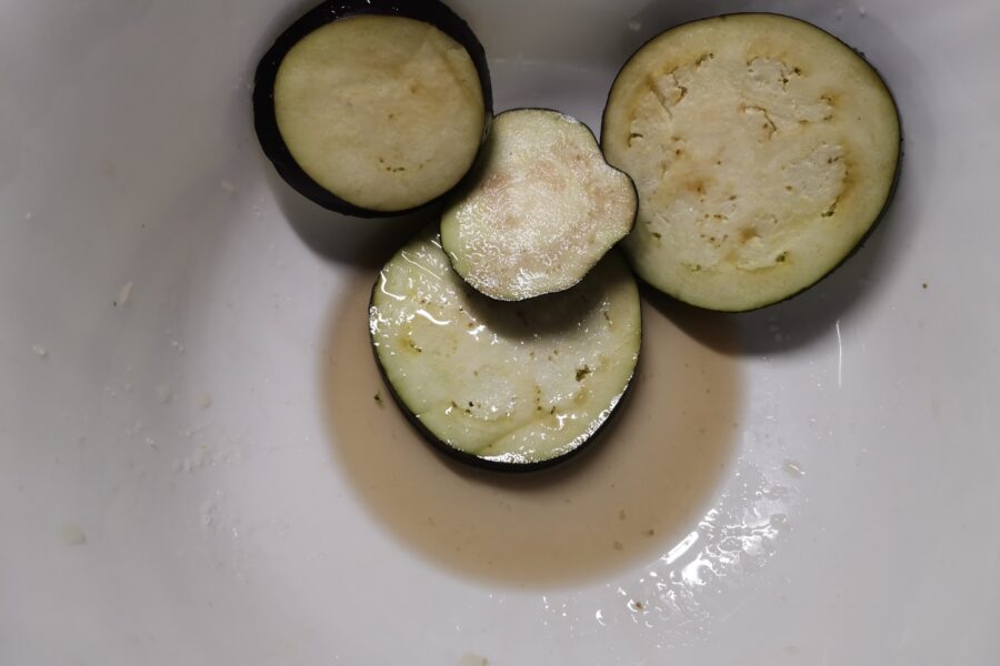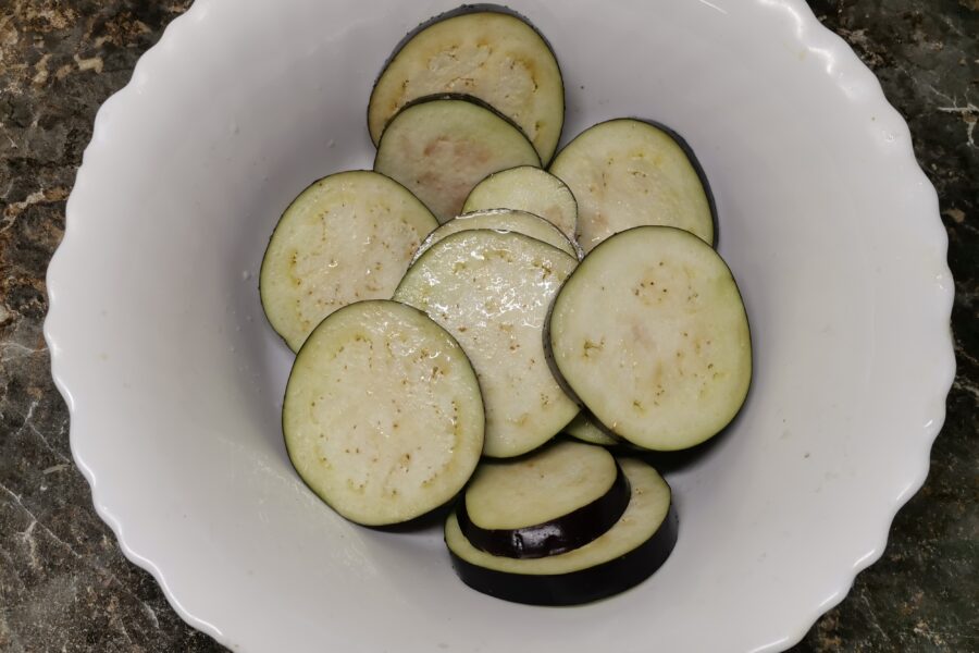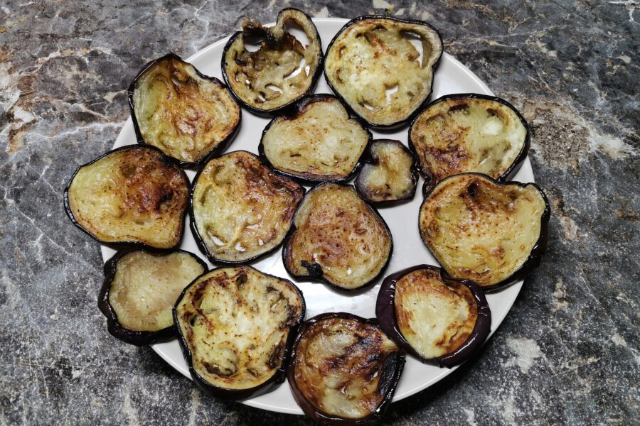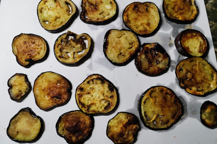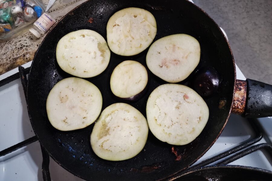 - In cantitate mica de ulei vegetal, prajim vinetele pe ambele parti, aproximativ 2-3 minute pe fiecare parte, pana cand devin aurii.