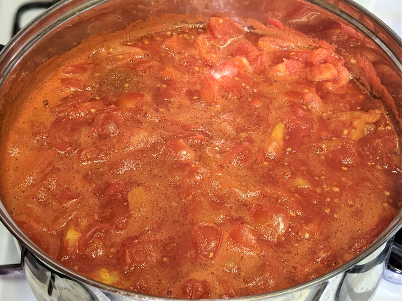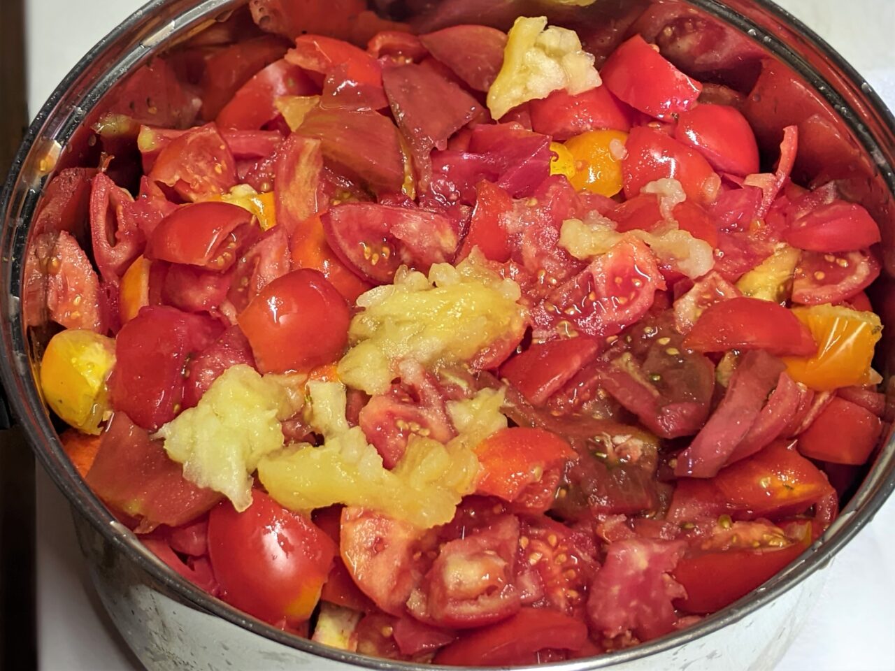 - Mai intai trebuie sa pregatiti sucul de rosii. Pentru a face acest lucru, luati rosiile coapte (puteti folosi rosii necoapte), taiati-le in bucati si puneti-le intr-o cratita din otel inoxidabil.