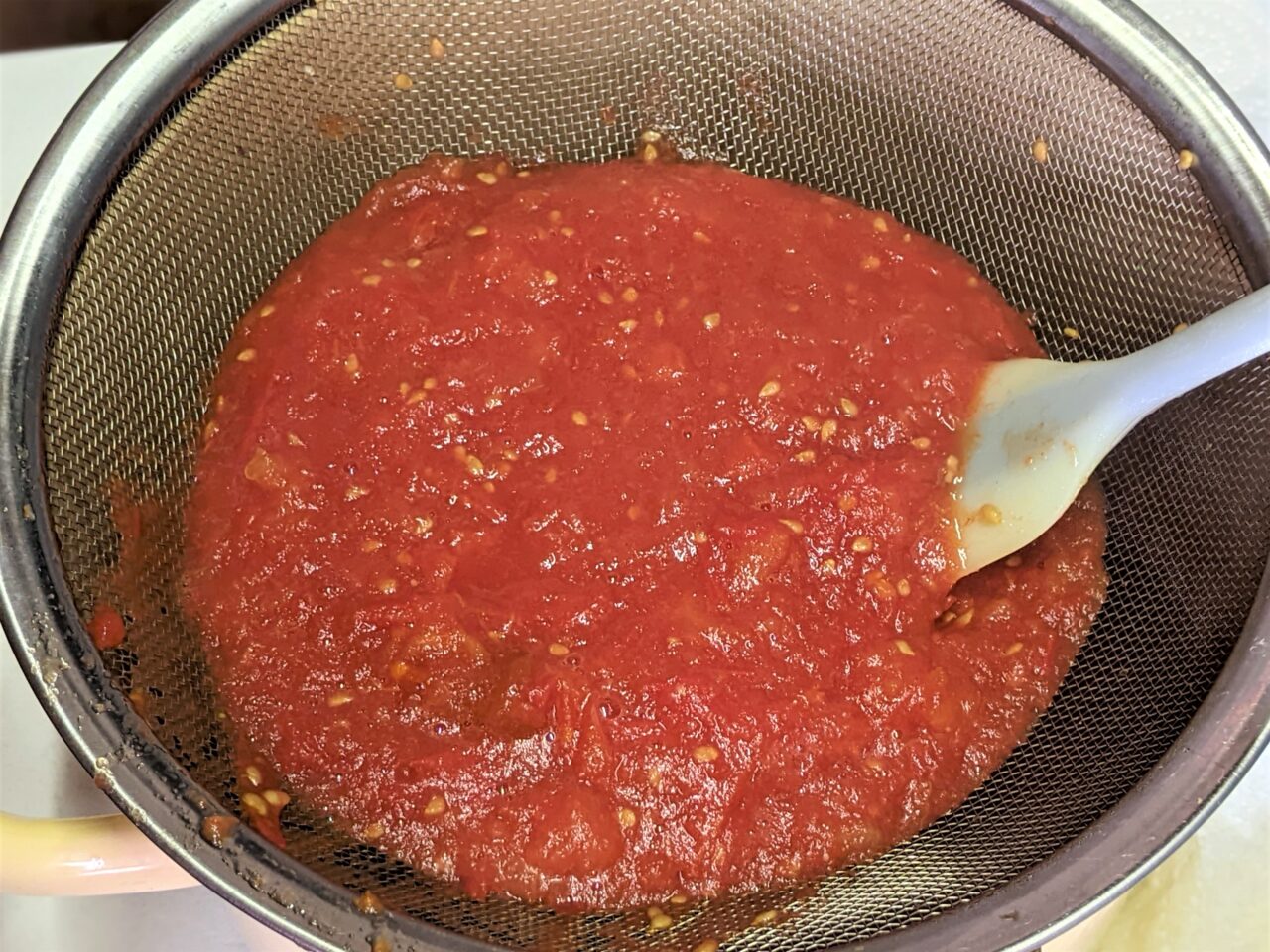 - Dupa ce rosiile sunt fierte, se fierb timp de 5 minute, le lasati sa se raceasca putin si pasati rosiile cu un blender de imersie. La ce foloseste blenderul? Pentru a usura trecerea rosiilor prin sita. Si vor fi mult mai putine deseuri! Desigur, puteti trece rosiile prin masina de tocat carne si nu va mai obositi sa le frecati prin sita. Dar, credeti-ma, va fi un gust si un aspect complet diferit.