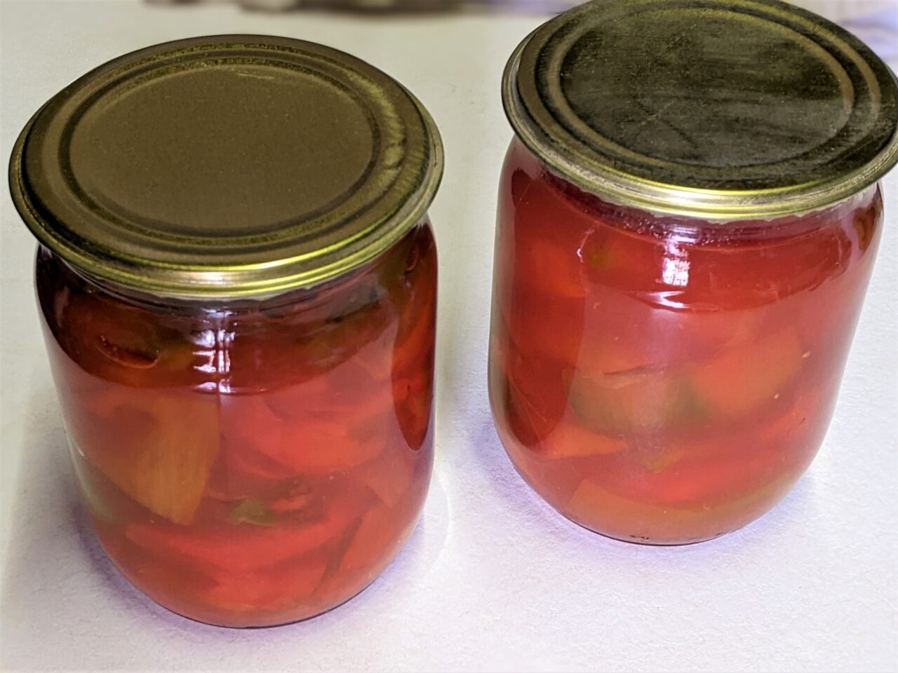 - Apoi se pun ardeii impreuna cu sucul in borcane sterilizate, se inchid cu capace sterilizate, se ruleaza, se intorc borcanele cu susul in jos si se lasa sub o patura pana se racesc complet. Din aceasta cantitate de legume am obtinut patru litri si jumatate de produse finite si inca mai am cateva bucati de ardei de incercat.