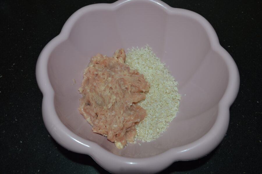 - Intr-un bol mare, puneti orezul spalat si carnea tocata.