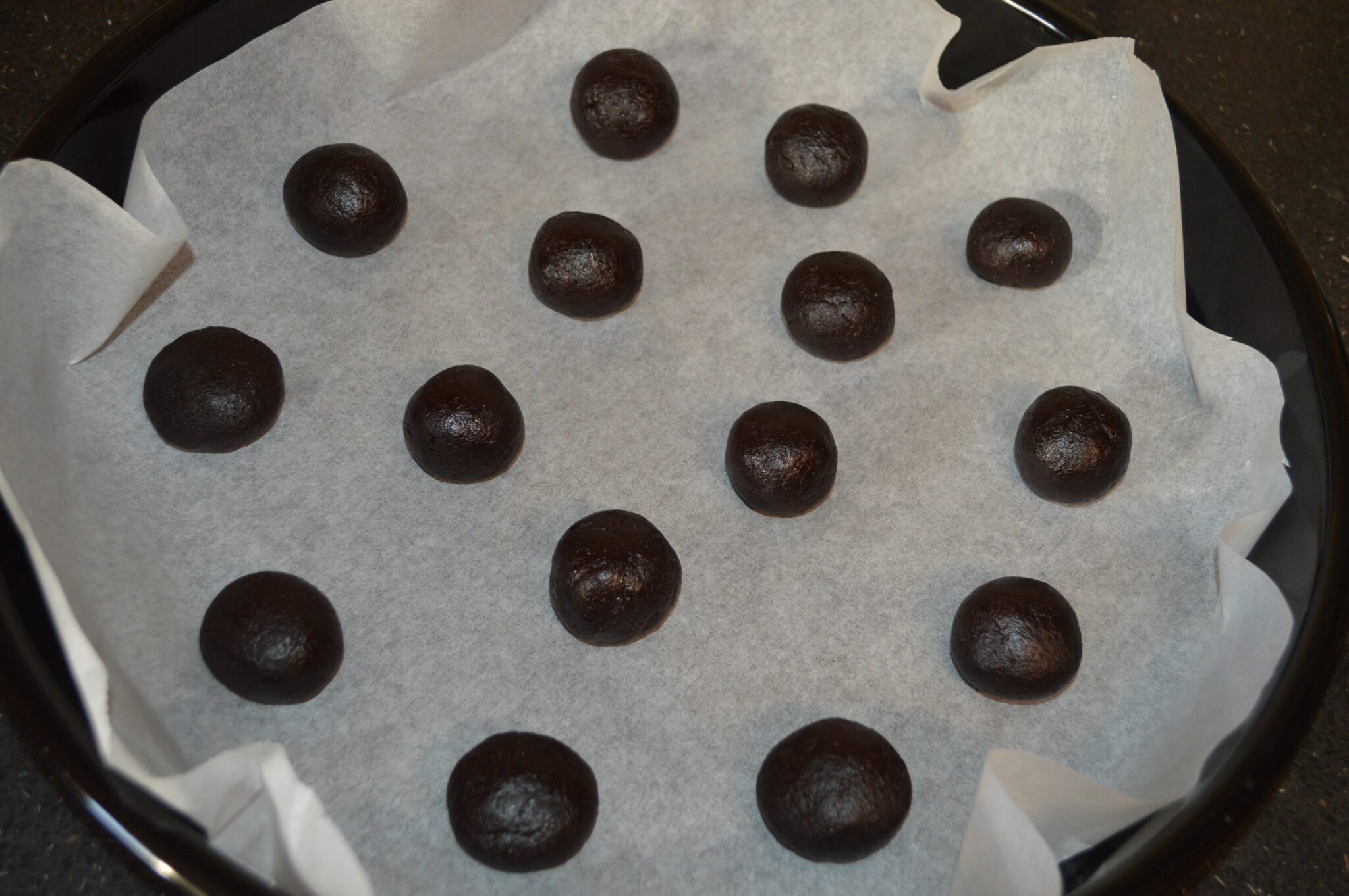 - Din aluat formati bilute mici, si puneti-le intr-o tava tapetata cu hartie de copt. Din asa cantitate de ingrediente mi-au iesit 15 bilute.