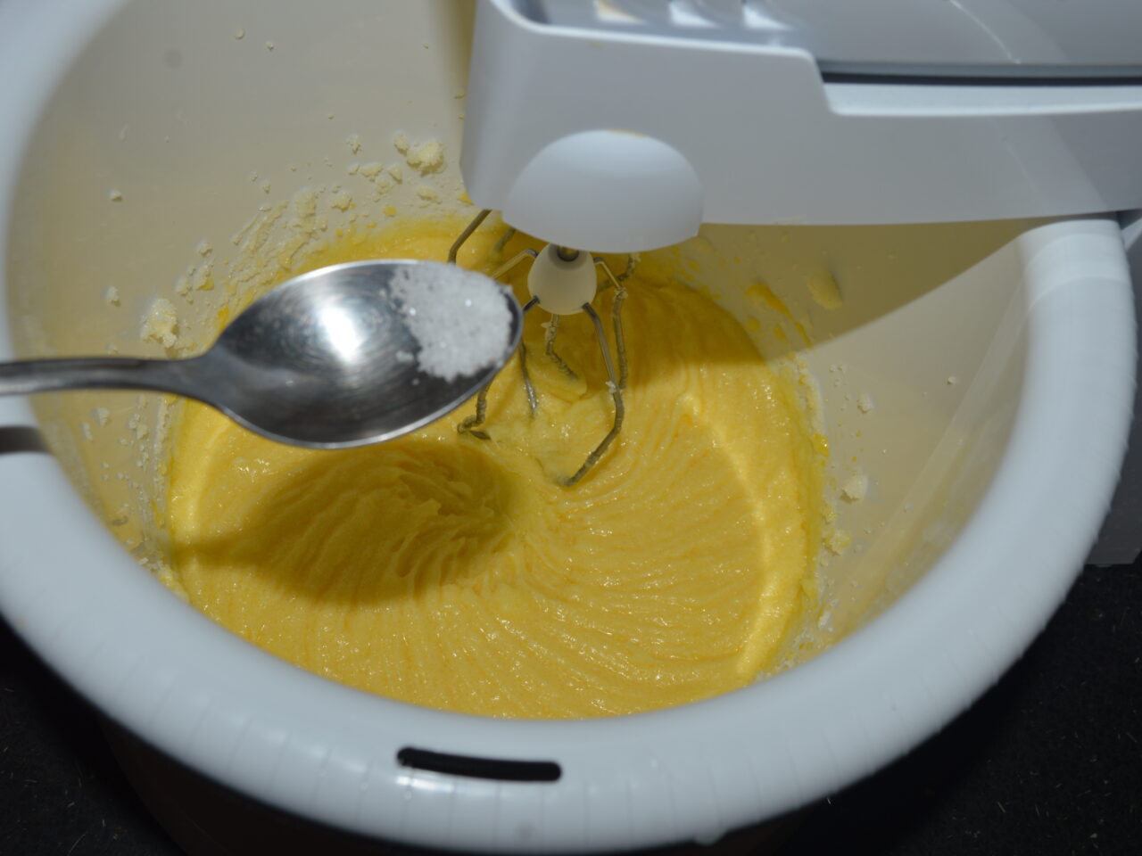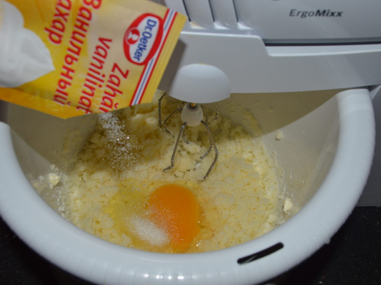 - Adaugati oul si zaharul vanilat, si bateti mai departe cu mixerul.