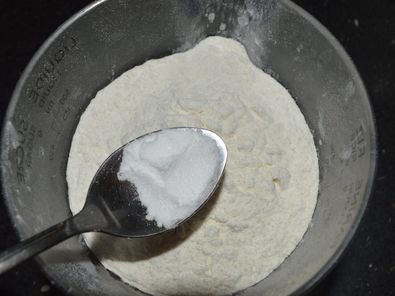 - Amestecati jumatate de lingurita de bicarbonat de sodiu cu faina.