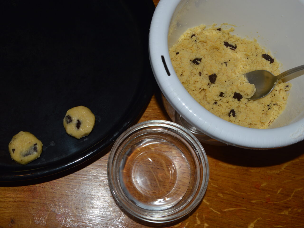 - Turnati putina apa intr-o farfurie adanca pentru a inmuia mainele, pentru a putea modela biscuitii in forma de bila. La fiecare bila inmuiati mainele in apa.