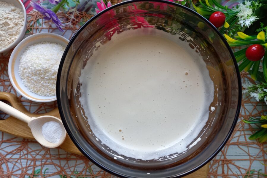 - Apoi, se amestecă nuca de cocos rasă și zahărul vanilat în amestecul pufos de ouă.