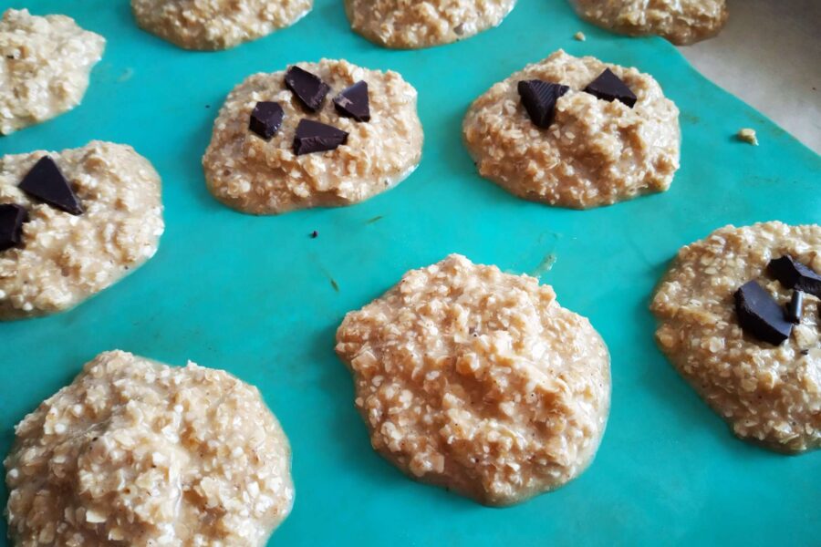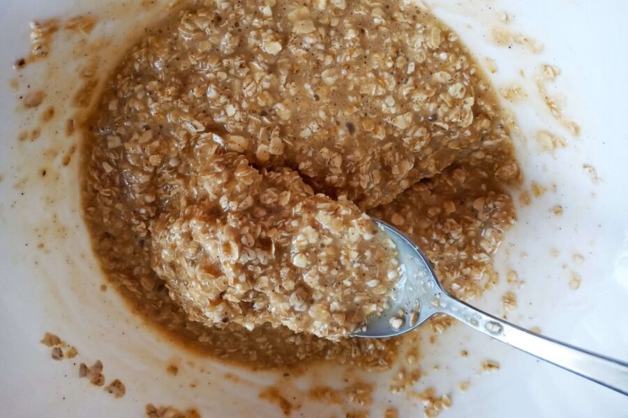 - Adăugați treptat de fulgi de ovăz. Aluatul trebuie să fie foarte moale și lipicios (chiar și ușor de tartinat), așa că este posibil să aveți nevoie de mai puțini fulgi.