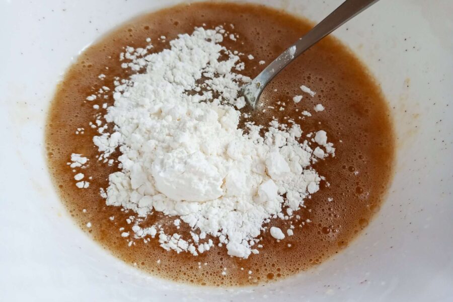 - Adăugați amidon de porumb și praf de copt. Amestecați.