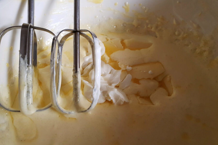 - Bateți gălbenușurile într-o spumă pufoasă cu zahăr și vanilie. Bătaia durează de obicei aproximativ trei minute.
