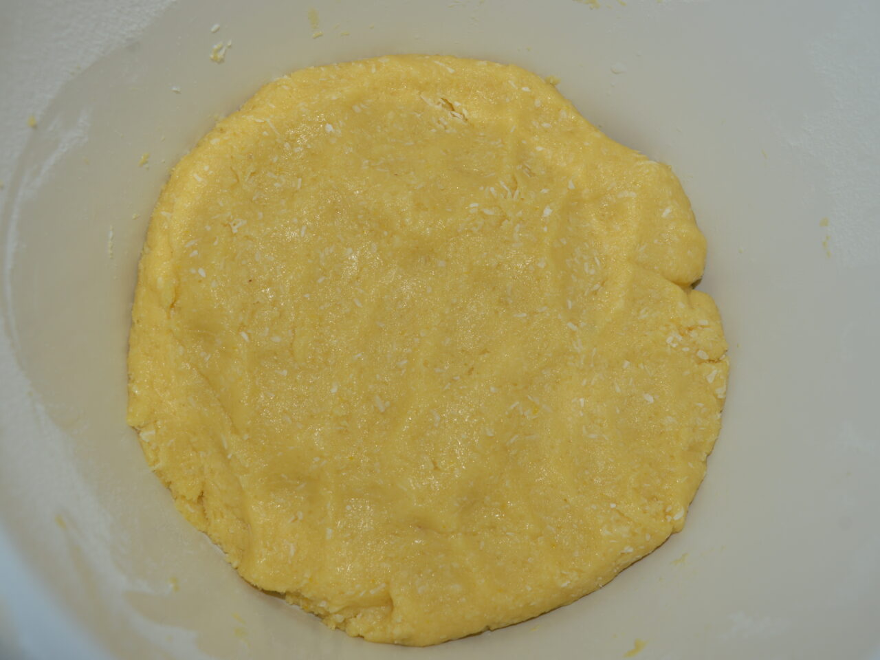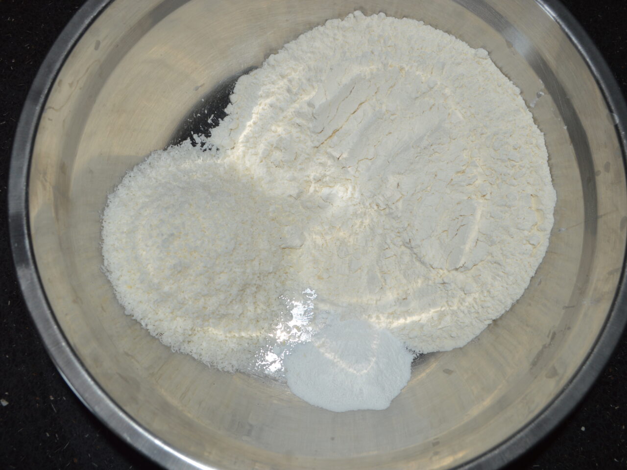 - Intr-un alt bol, amestecati faina cu nuca de cocos razuita si praful de copt.