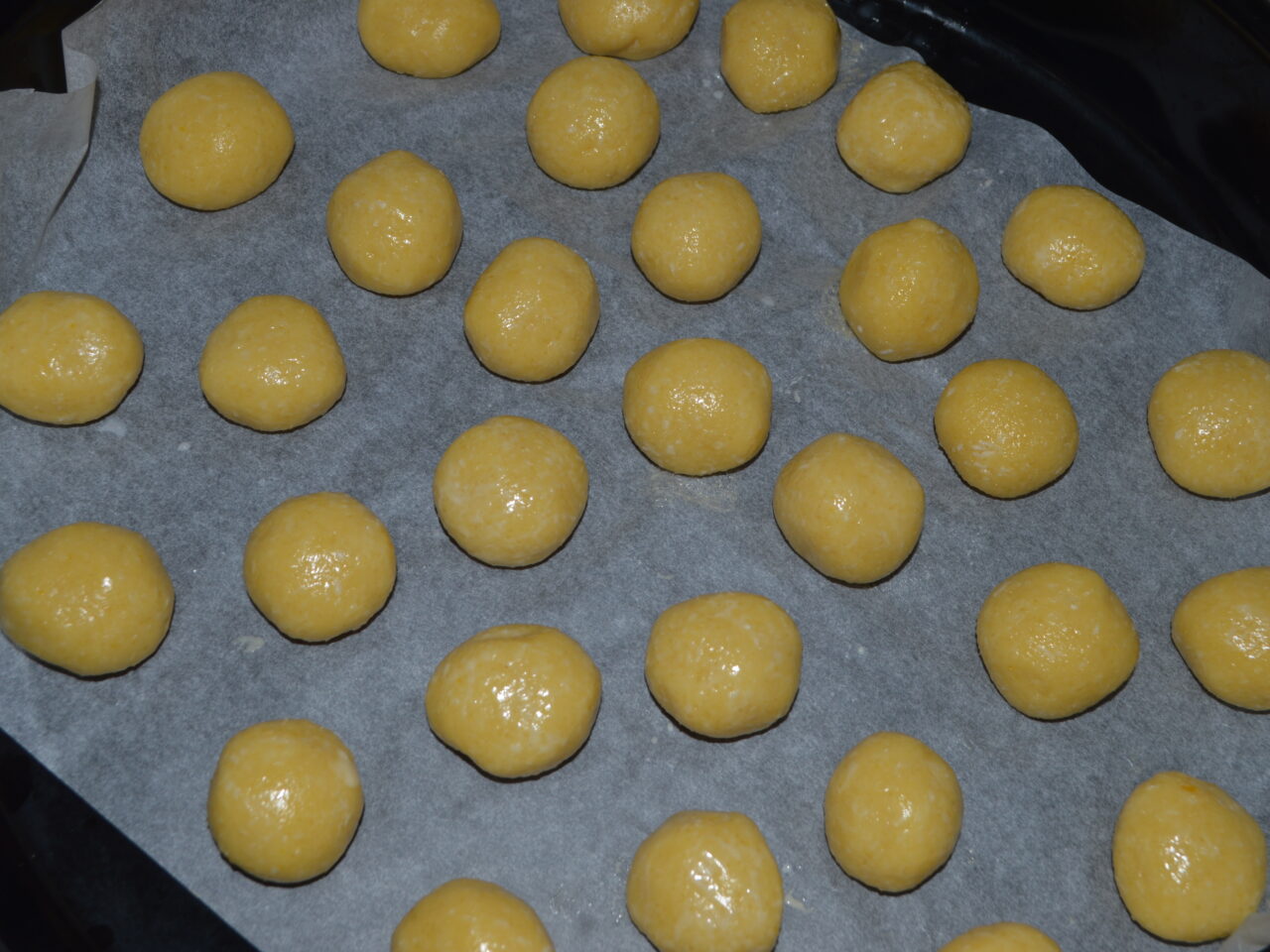- Formati bilute mici din aluat, si le puneti in tava asternuta cu hartia de copt. Dati la cuptorul preincalzit la 180 de grade C, timp de 10-12 minute.