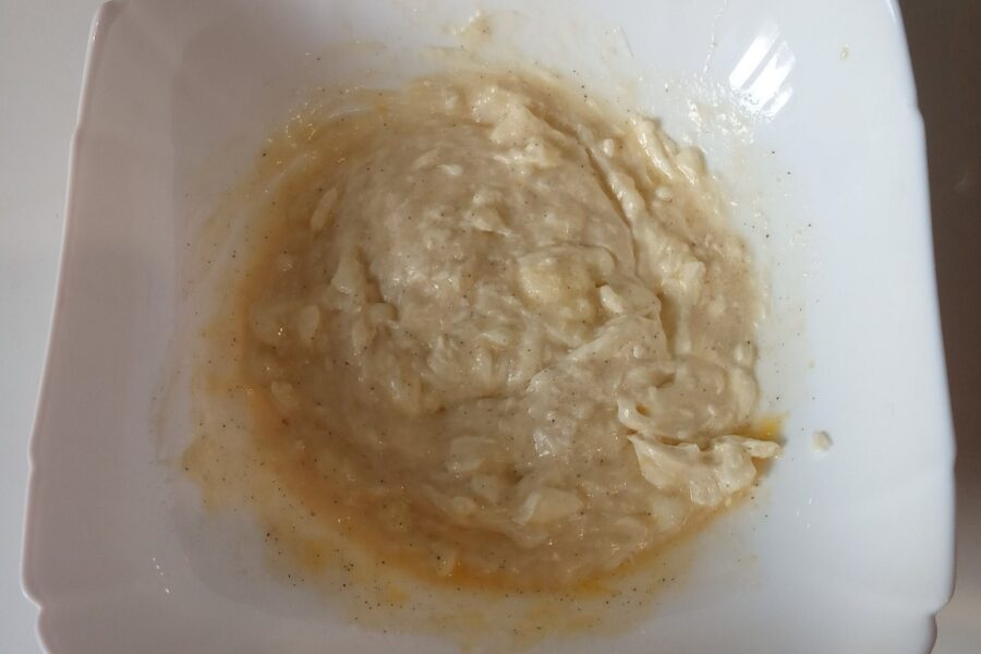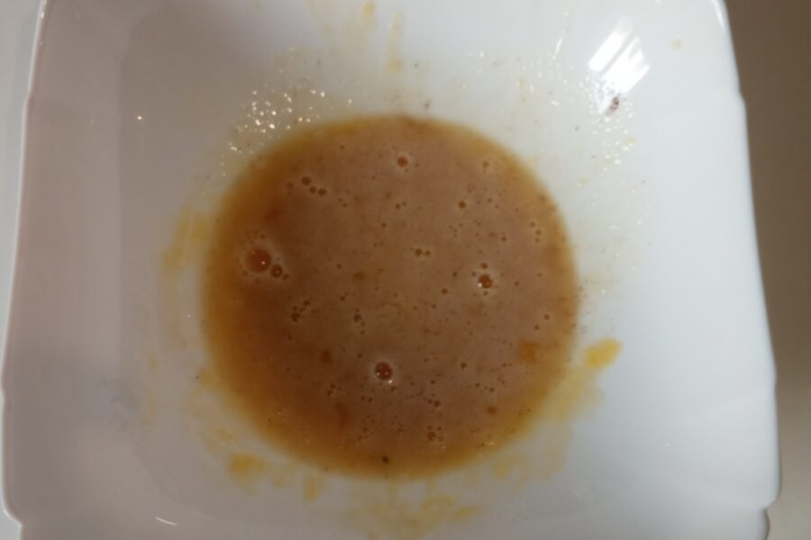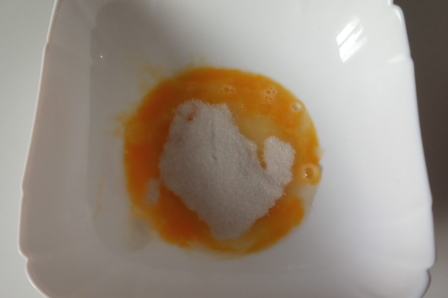 - Se bate oul și se adaugă îndulcitorul. Această rețetă folosește zahăr tradițional, îl puteți înlocui cu stevia.