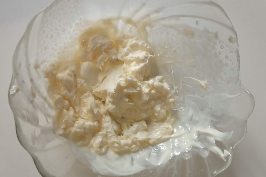 - Când untul a ajuns la o consistență convenabilă, se combină cu produsele de mai sus. Se amestecă foarte bine și se adaugă vanilia.