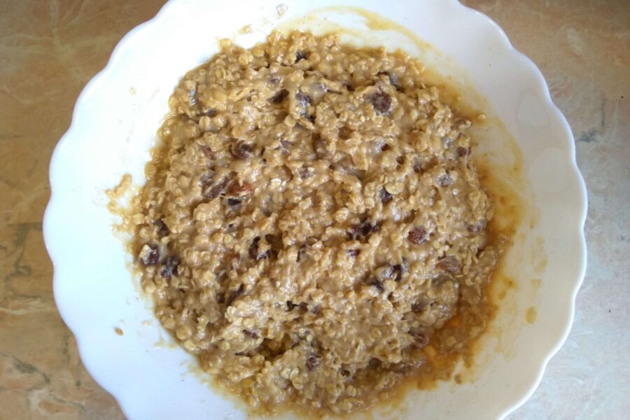 - Într-un recipient separat, amestecați fulgii, stafidele, făina și alte ingrediente uscate. Combinați ambele boluri pentru a forma o masă ușor vâscoasă.