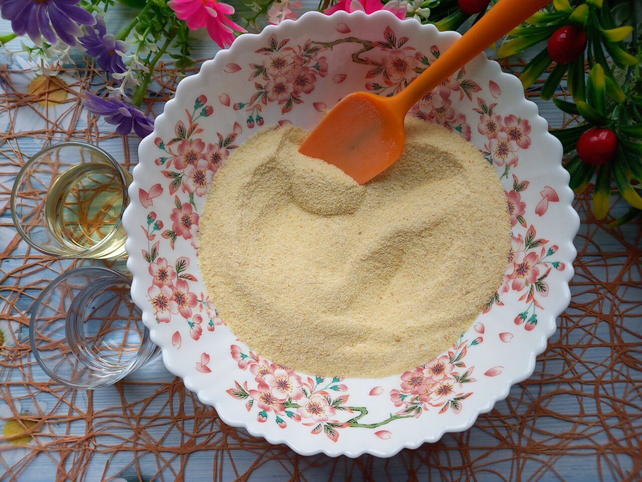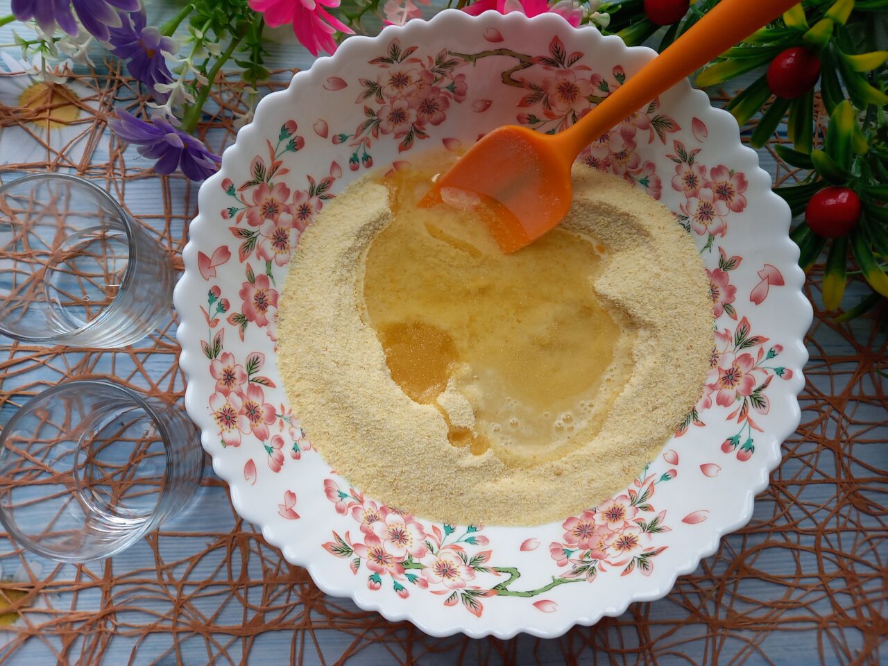 - Apoi se toarnă apa și uleiul în amestecul uscat. Amestecați totul foarte bine și lăsați totul timp de aproximativ zece minute (sau mai mult).
