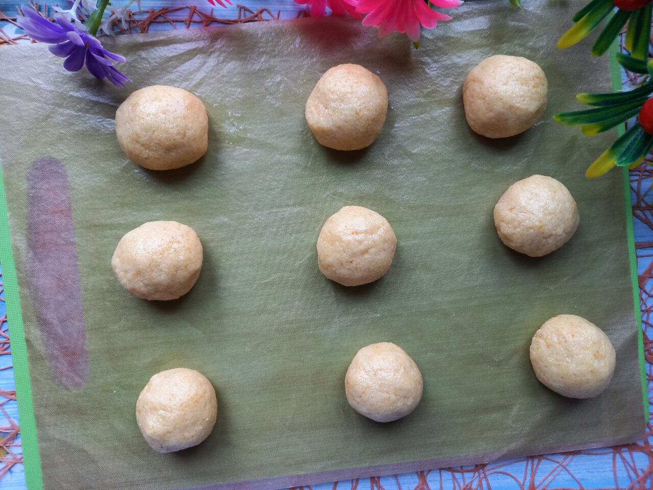 - Se frământă din nou bine amestecul de griș. Aluatul de biscuiți nu trebuie să fie sfărâmicios. Dacă este necesar, mai adăugați puțin lichid (ulei sau apă). Ca urmare, dorim ca aluatul să fie ușor lipicios și foarte moale. Împărțiți-l în mai multe bucăți și tăvăliți-l în bile puțin mai mici decât o minge de tenis de plastic. Așezați bucățile pe o tavă de copt (eu am căptușit-o cu un covoraș de teflon) și puneți-le la cuptor pentru o treime de oră.