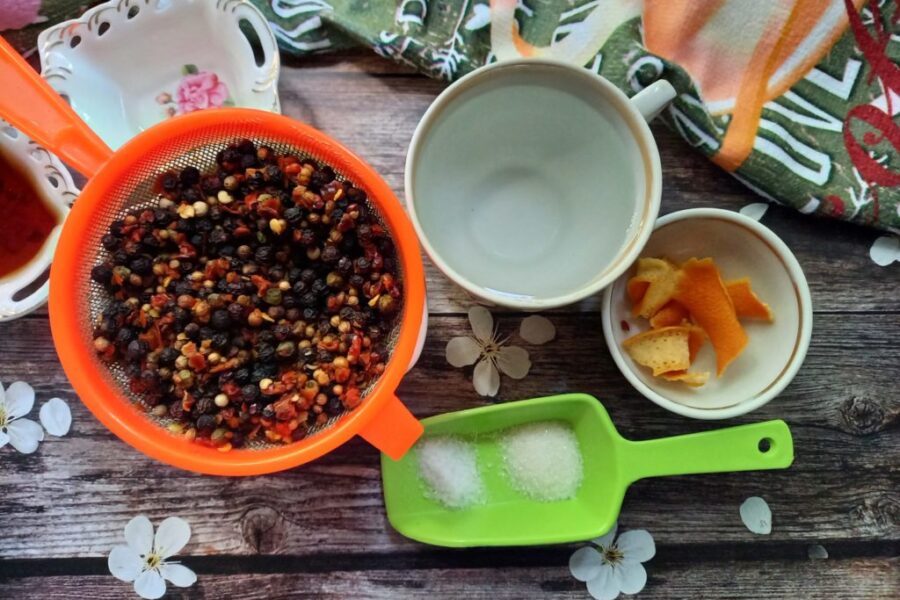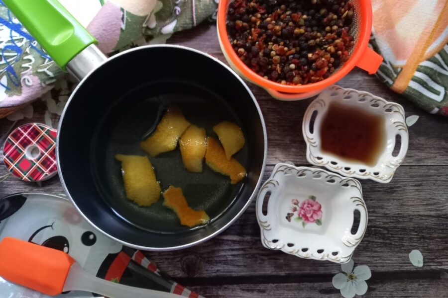 - Mai întâi clătiți amestecul de boabe de piper sub jet de apă rece și scurgeți-l într-o sită. Apoi se toarnă într-un castron și se scaldă cu apă clocotită (aici folosim apă potabilă). Din nou se scurge piperul pe o sită. În timp ce se scurge excesul de apă din amestec, pregătiți marinada. Pentru a face acest lucru, într-un recipient mic fierbeți apă potabilă (150 ml.), adăugând sare în ea împreună cu coaja de portocală și zahăr.