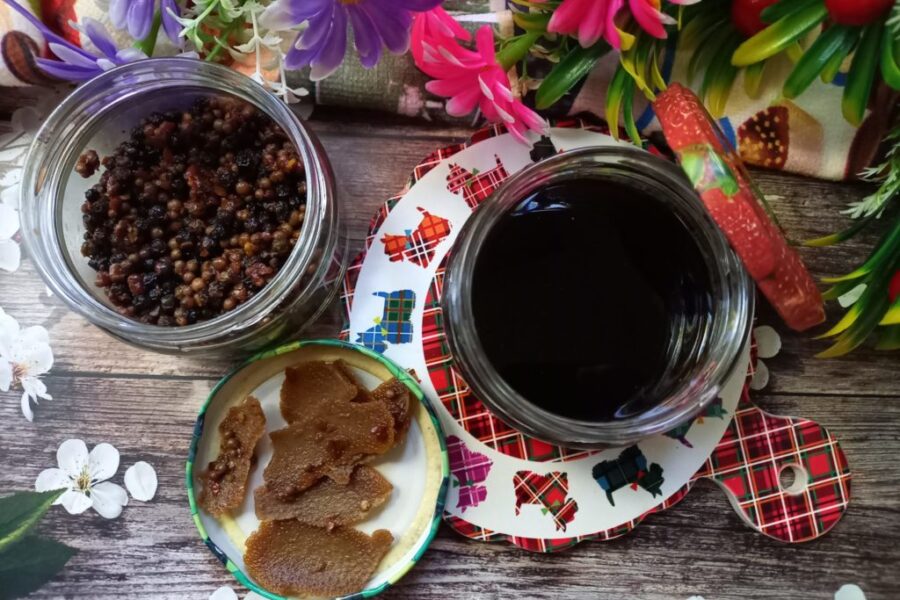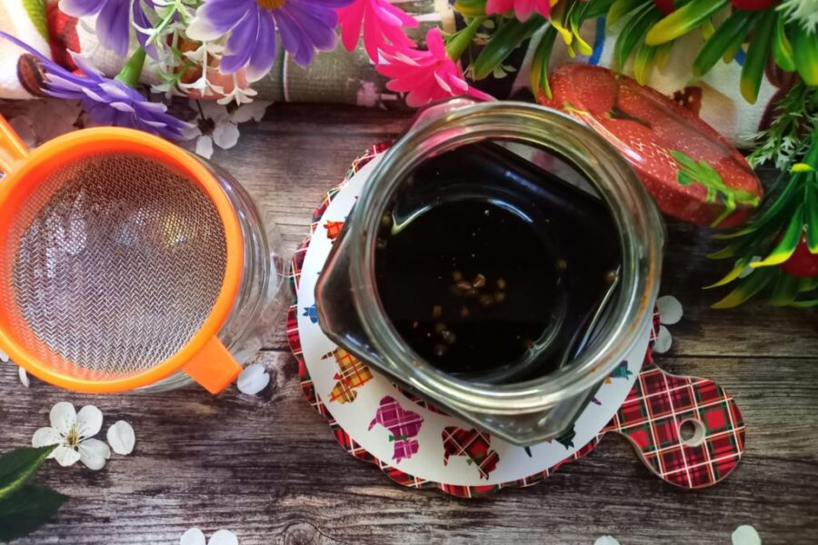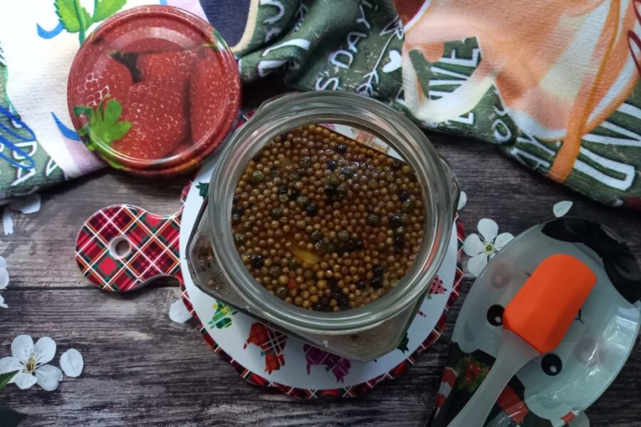 - În 48-70 de ore, boabele de piper nu numai că va absorbi cât mai multă umezeală și va deveni foarte moale, dar va satura și marinada cu aromele sale. Cu ajutorul unei strecurătoare, se strecoară conținutul borcanului, separând boabele înmuiate de marinada semnificativ întunecată.