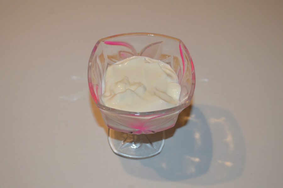 - Intr-un pahar pentru deserturi adaugati iaurtul grecesc (eu folosesc iaurt grecesc de 2% grasime, in asa fel are foarte putine calorii si multe proteine, dar puteti folosi si iaurt cu procent de grasime mai mare, in dependenta de gustul fiecaruia).