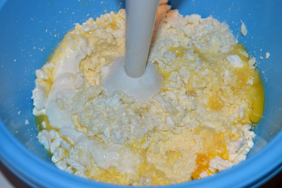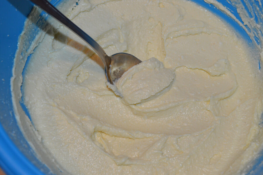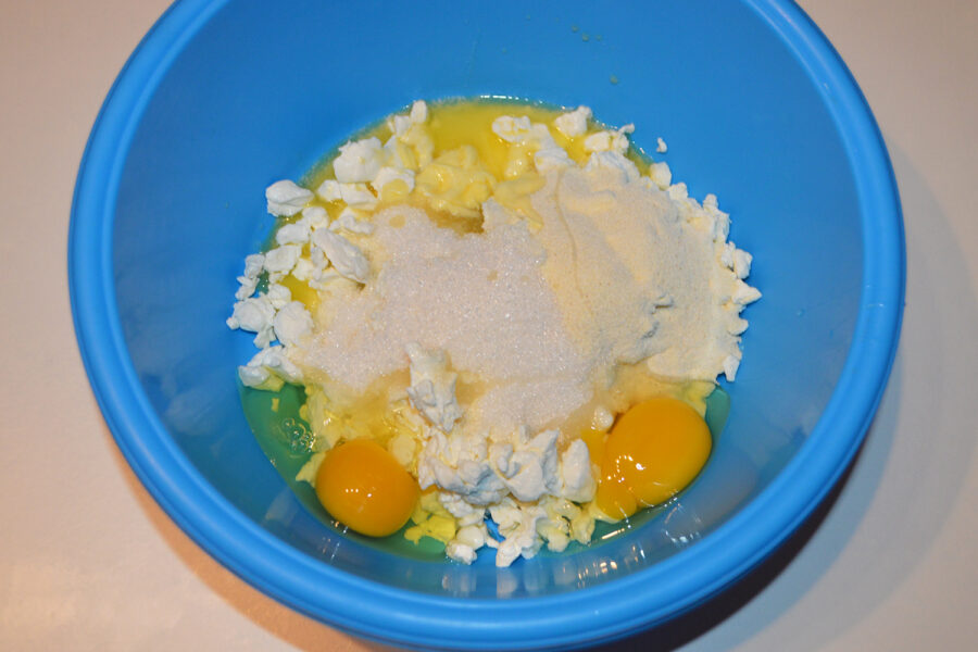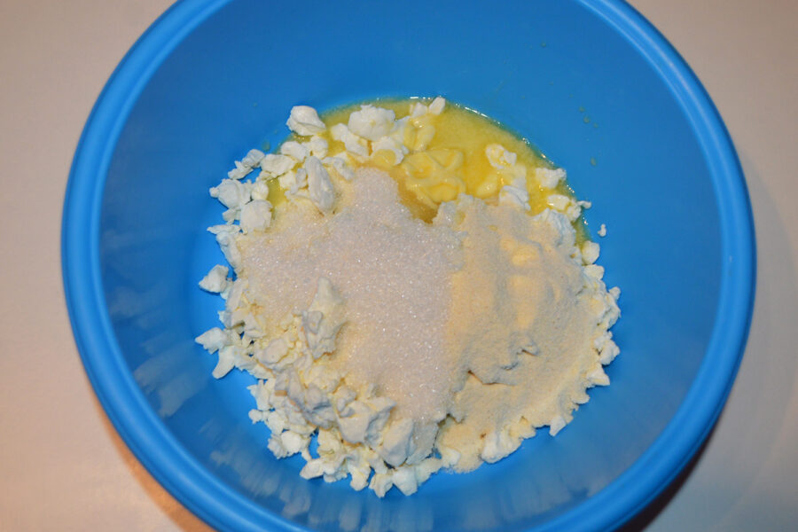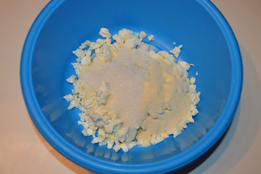- Puneti branza de vaci intr-un bol adanc, adaugati zaharul.