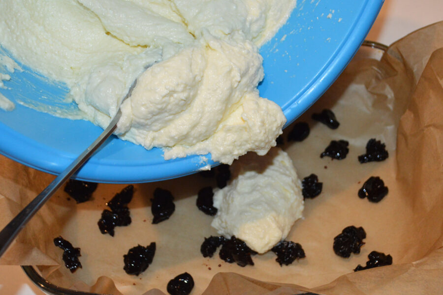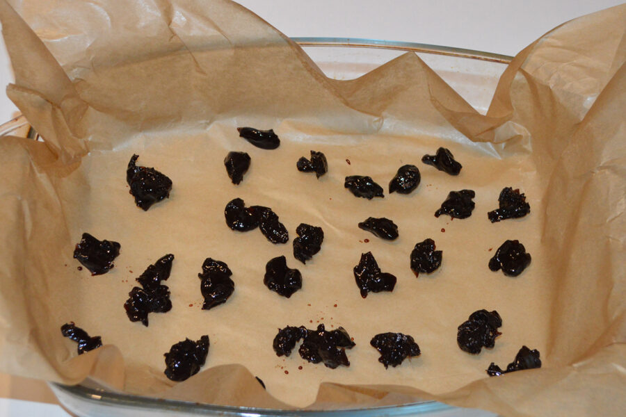 - Tapetati o tava cu hartie de copt, si aranjati dulceata. Eu am folosit dulceata de visina, insa puteti folosi si alt tip de dulceata deasa, sau puteti taia bucati de ciocolata, stafide, fructe proaspete sau congelate. Dupa placul fiecaruia.