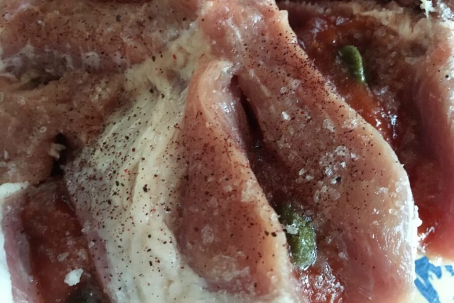 - Se asezonează cu sare și se presară un praf de condiment roșu aprins.