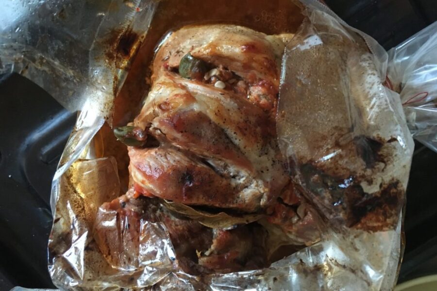 - Se coace (de preferință în modul convecție) timp de 60-70 de minute. Temperatura din cuptor trebuie să fie peste medie – aproximativ 260 de grade. După ce ați tăiat folia, răciți carnea de porc.