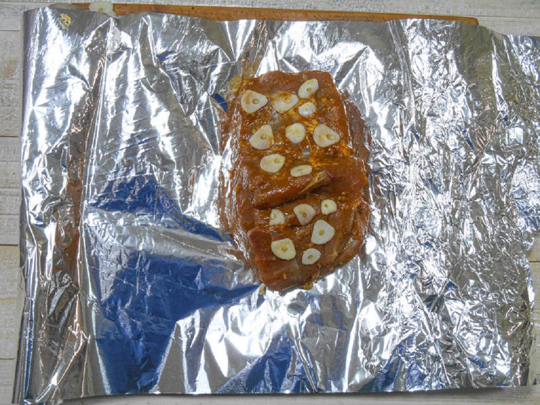 - Carnea se presara cu sare, piper si ierburi de provence. Usturoiul se curata si se taie felii subtiri. Bucata de carne se pune pe folie, iar deasupra se adauga usturoiul.