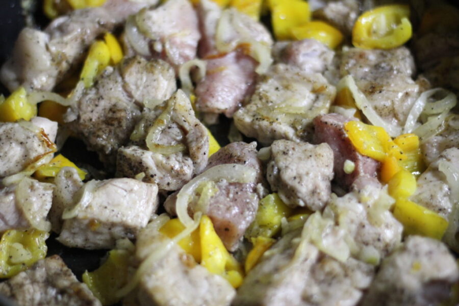 - Mai întâi trebuie să curățați ceapa și să o tăiați în felii. Ardeii dulci galbeni trebuie tăiați în felii mari. Se calesc ingredientele in ulei rafinat pana se rumenesc.