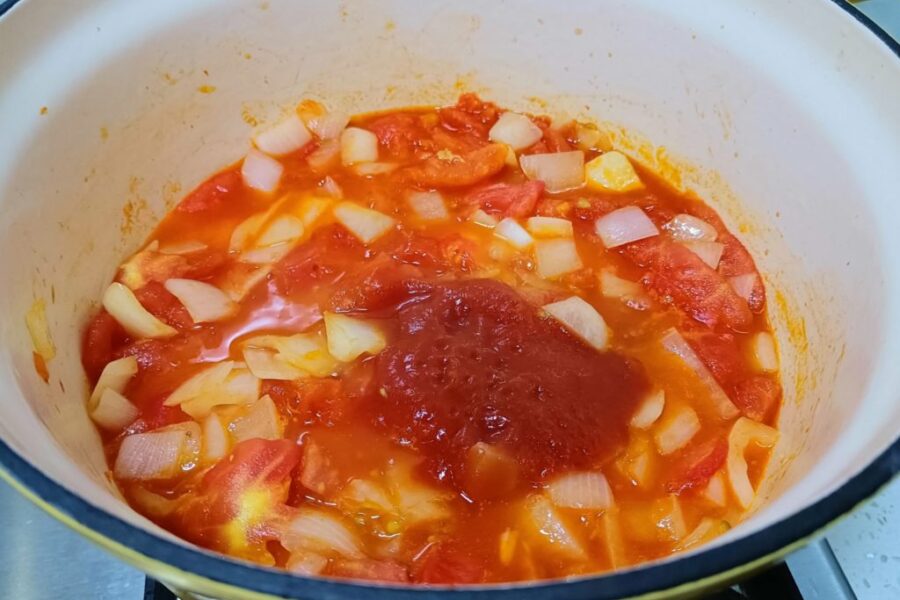 - Tăiați roșiile cubulețe, adăugați în tigaie și fierbeți până se îngroașă. Adăugați sosul de roșii, amestecați.