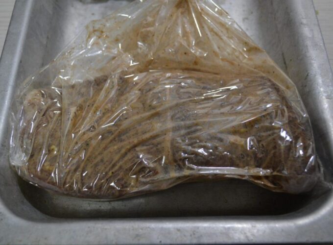 - Puneti recipientul cu carnea de vită la frigider pentru 5-6 ore, sau mai bine, peste noapte, pentru a marina. După marinare, transferați bucata de carne marinată într-o maneca de copt, legați-o, faceți 1-2 înțepături în mmaneca pentru a permite aburului să iasă.