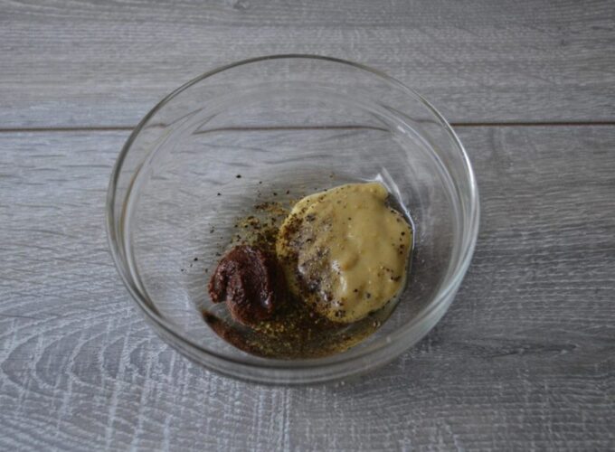 - Pentru a pregăti marinada, puneți muștar de cereale gata preparate, adjica într-un castron mic, turnați ulei vegetal și adăugați piper negru și roșu măcinat. În loc de muștar granulat, puteți folosi muștar obișnuit.