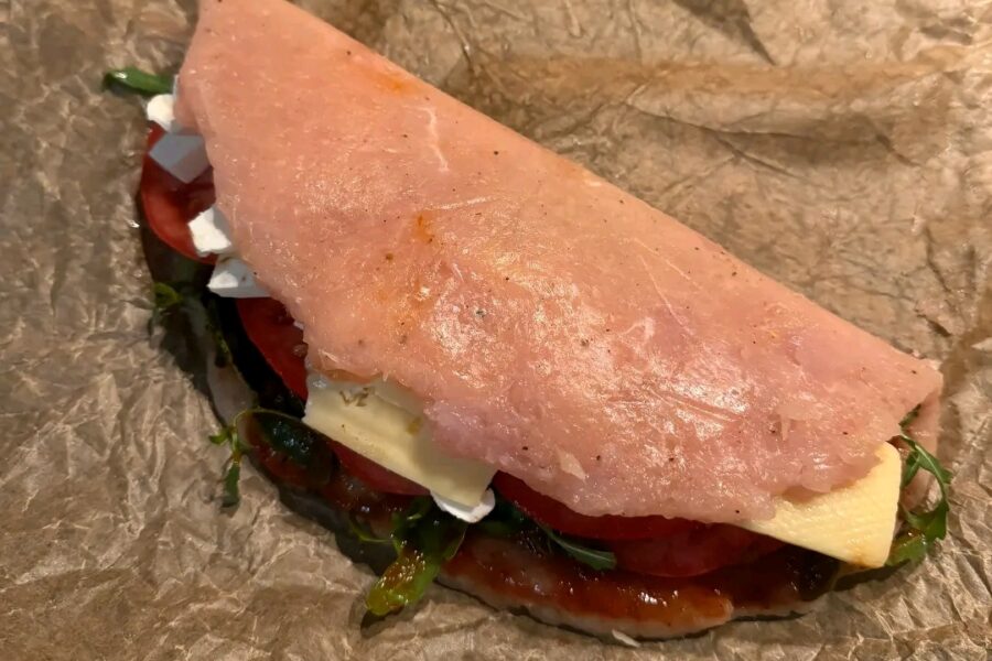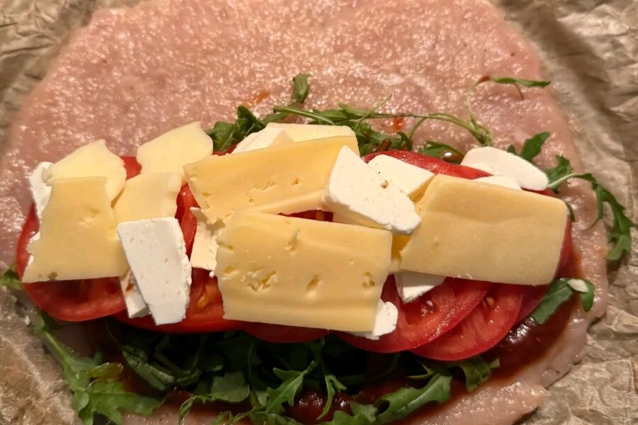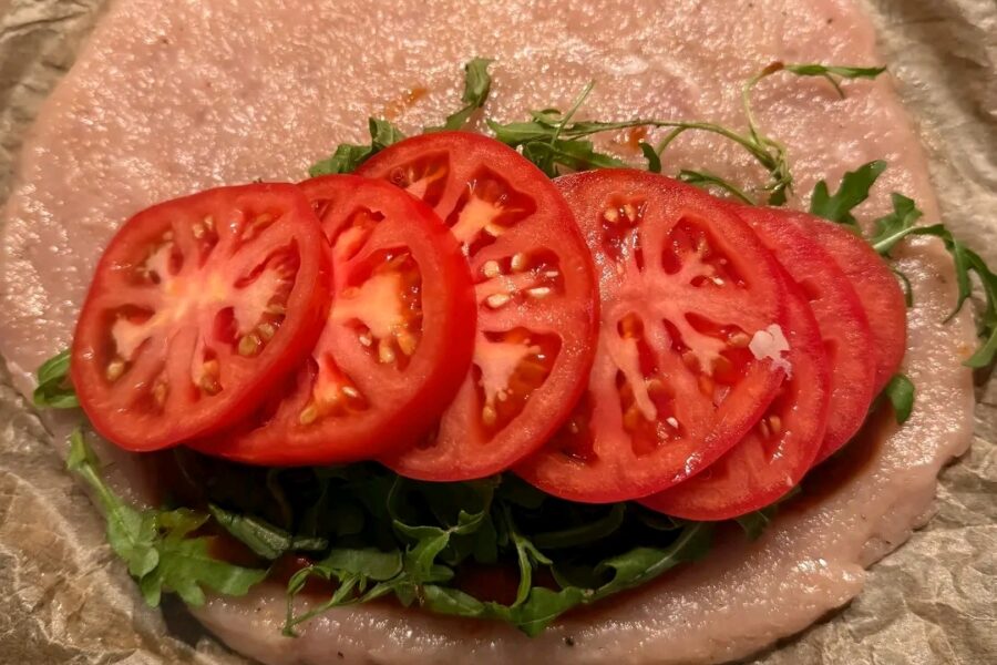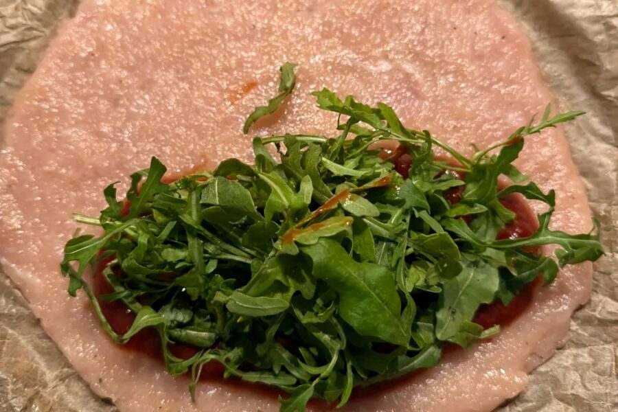 - Ungeti o jumatate cu ketchup sau sos rosu, si adaugati rucola.