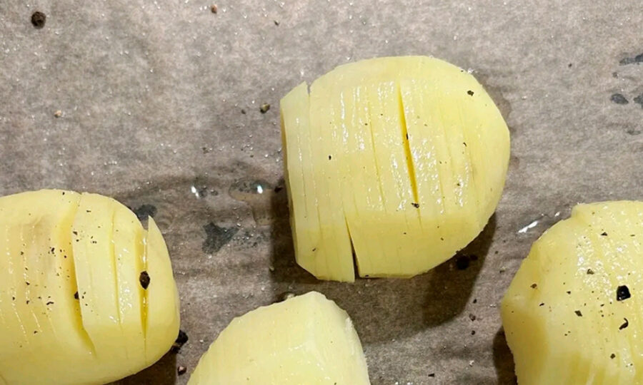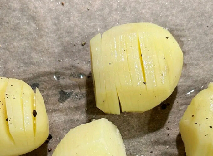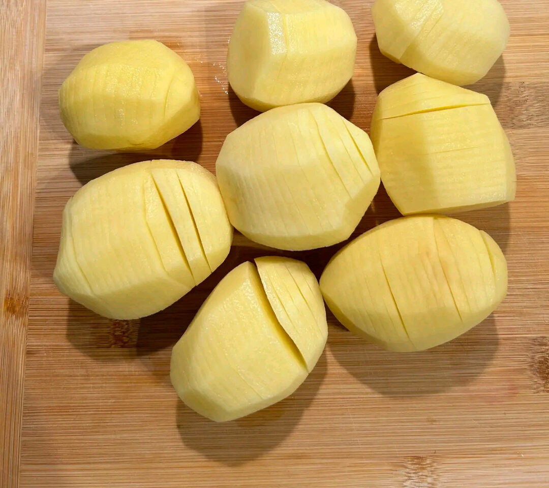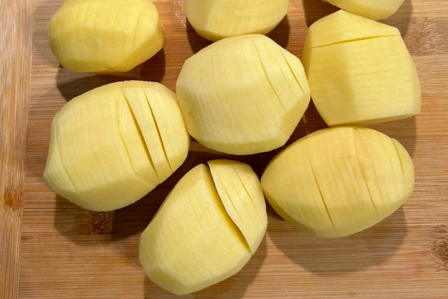 - Curatiti cartofii de coaja, si puneti-i intr-o lingura mare si adanca, si faceti taieturi paralele adanci la intervale de 3 mm de sus in jos, lingura nu va permite taierea cartofului pana la capat. Puneti-i intr-un bol cu apa sarata, si lasati-i timp de 15 minute.