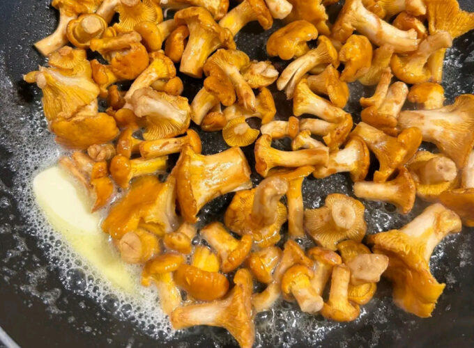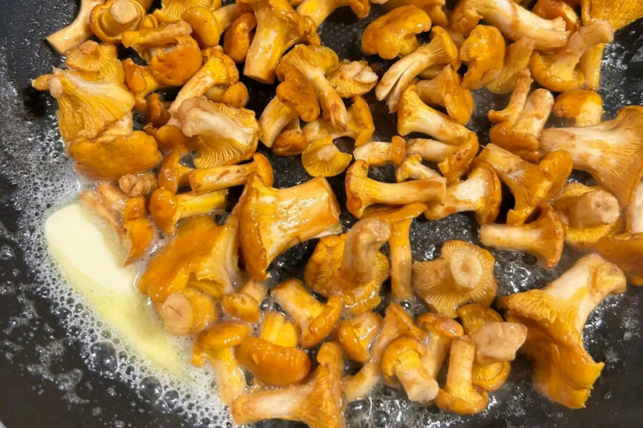 - Intr-o tigaie topiti untul, apoi puneti ciupercile galbiori la prajit. Presarati sare si piper dupa gust.