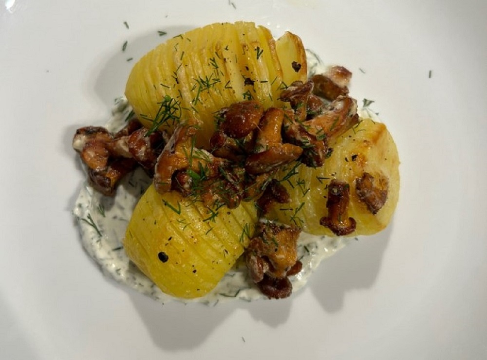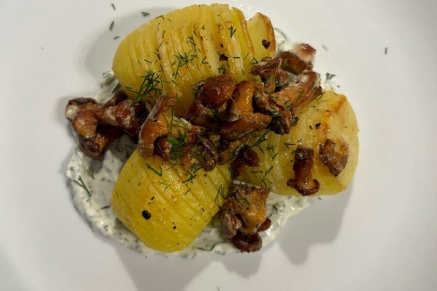 Reteta de cartofi in garmonie la cuptor, cu ciuperci galbiori gatiti la tigaie, si sos de smantana cu marar. O mancare absolut delicioasa, din ingrediente simple.
