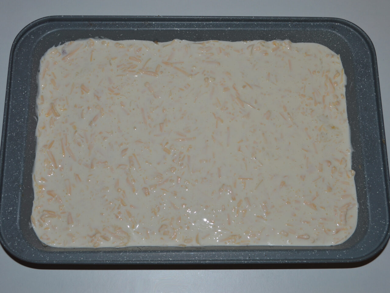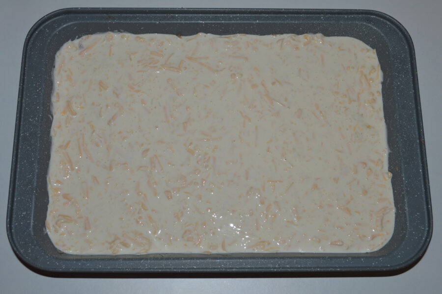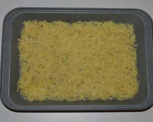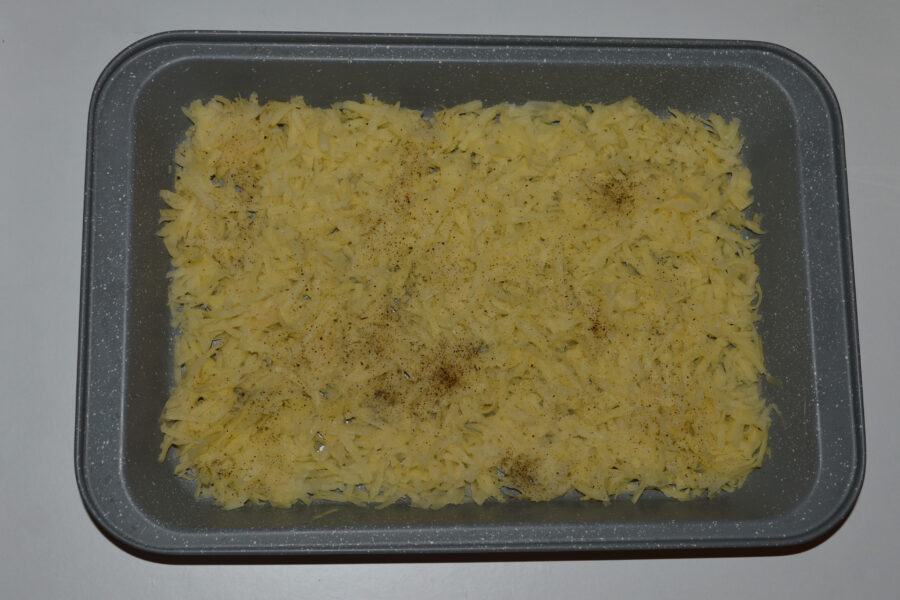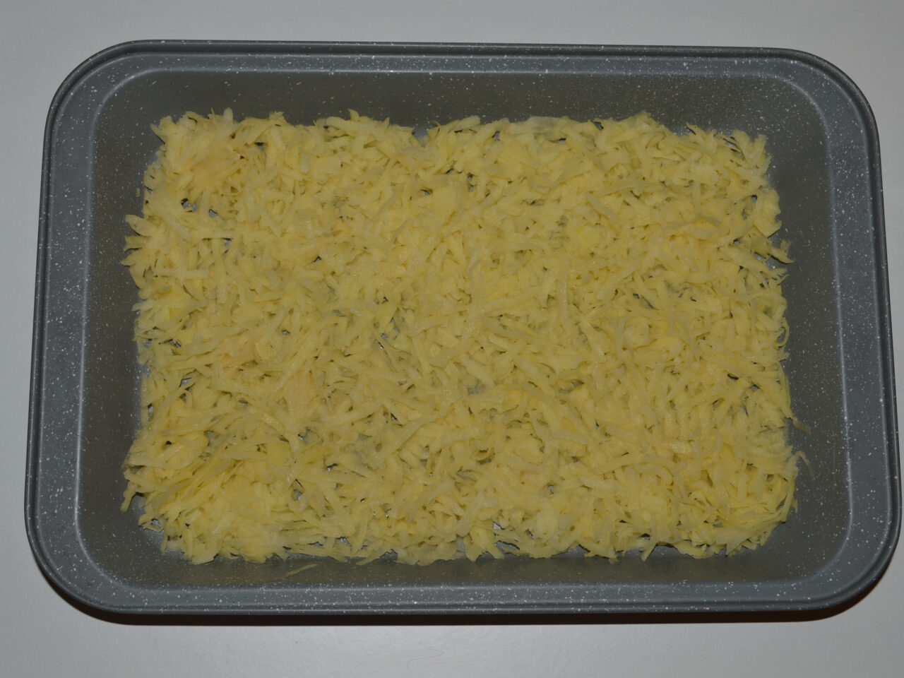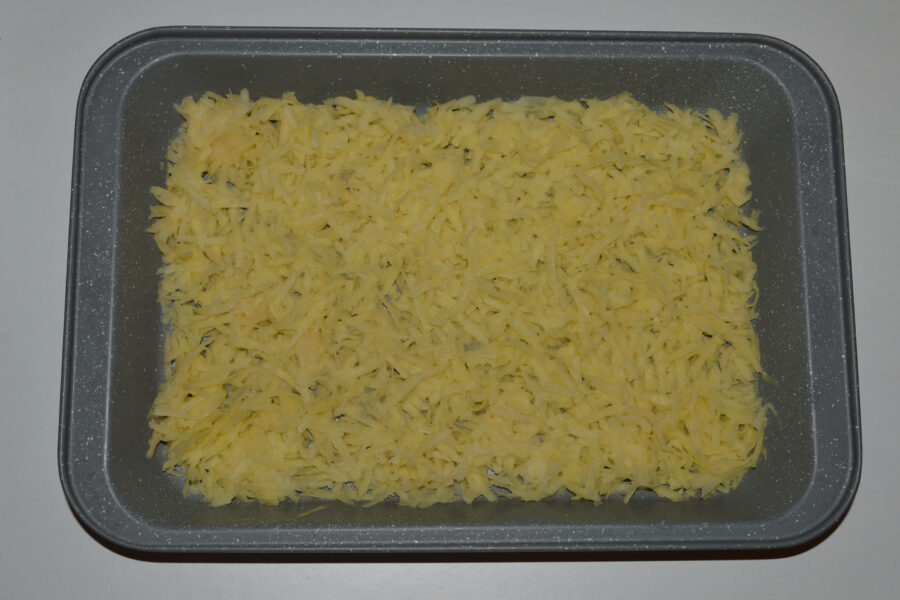 - Curatiti cartofii de coaja, spalati-i si dati-i pe o razatoare grosiera. Scurgeti bine lichidul din cartofii rasi si transferati-i pe o tava de copt, intr-un strat uniform. Eu am folosit o tava de 37 cm.