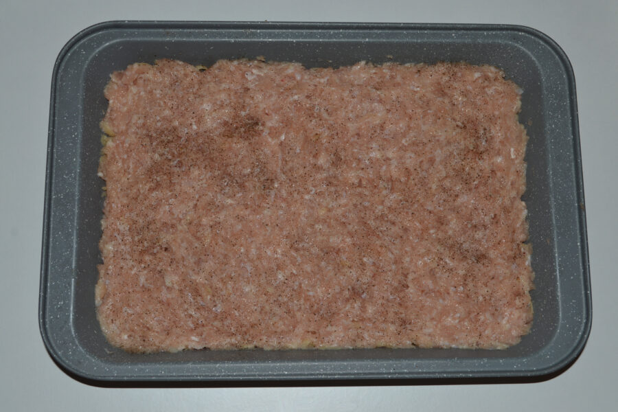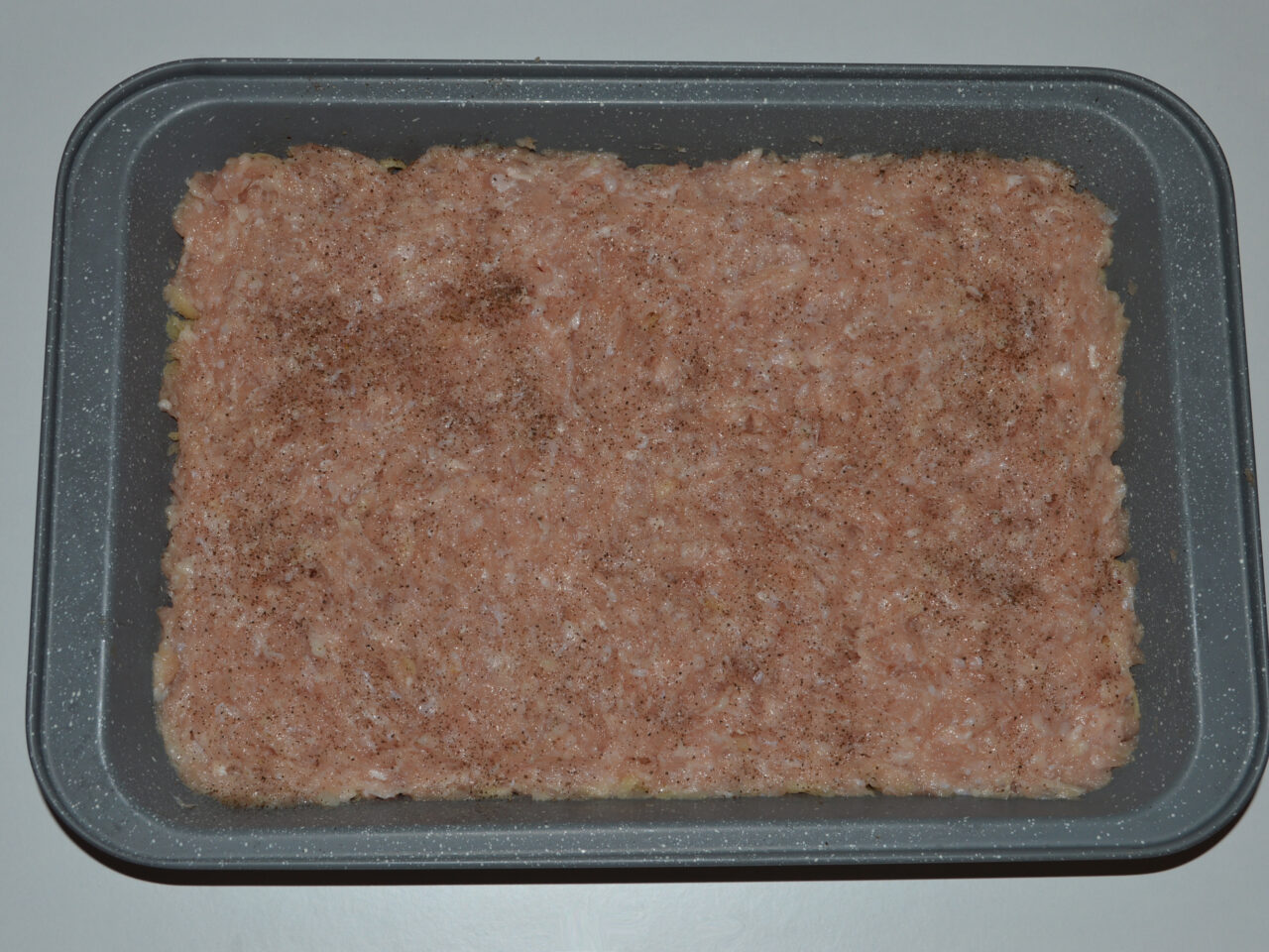 - Al doilea strat va fi carnea tocata de pui, la fel presarati sare si piper.