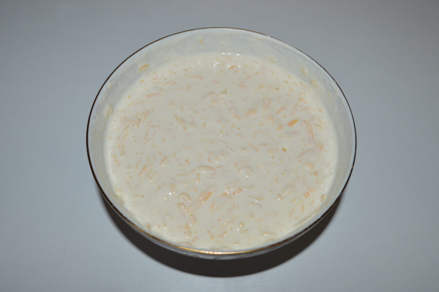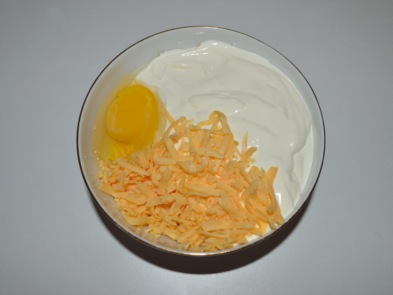 - Dati pe razatoarea grosiera cascavalul tare. Transferati-l intr-ul bol, si adaugati smantana si un ou.