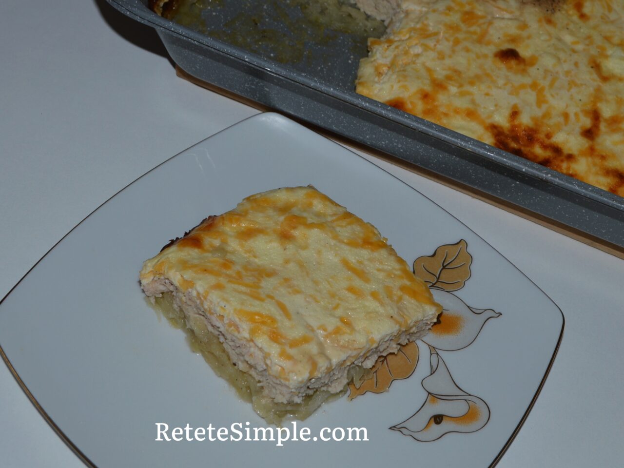 Reteta de cartofi rasi pe razatoare cu carne tocata de pui, si sos de smantana cu cascaval in straturi, preparata la cuptor. O mancare gustoasa pentru pranz sau cina, trebuie doar sa puneti toate ingredientele necesare in tava si va ramine sa asteptati timp de o ora, si aveti o mancare cu adevarat delicioasa si savuroasa.