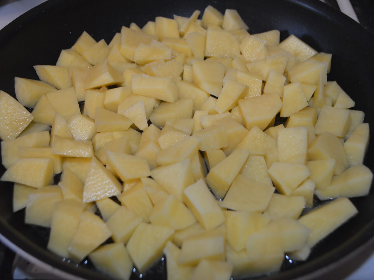 - Curatati cartofii de coaja, spalati-i si taiati-i in cuburi. Incingeti o tigaie cu ulei, apoi adaugati cartofii in tigaie, la foc mediu. Gatiti timp de 5-7 minute, cu capac.