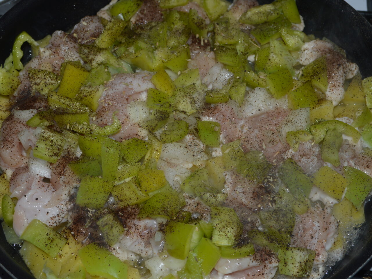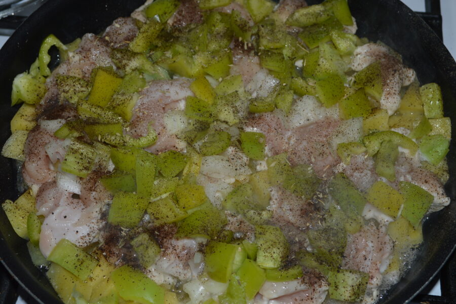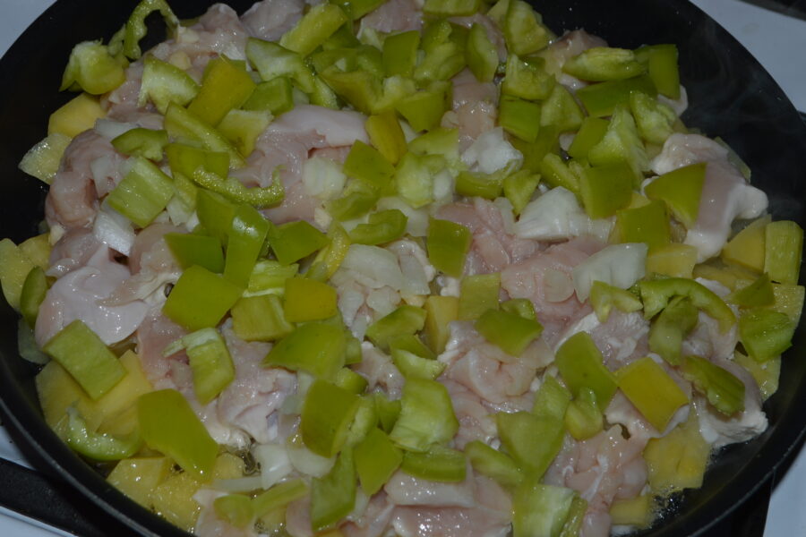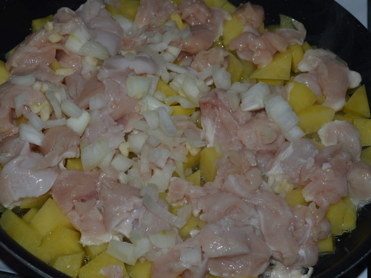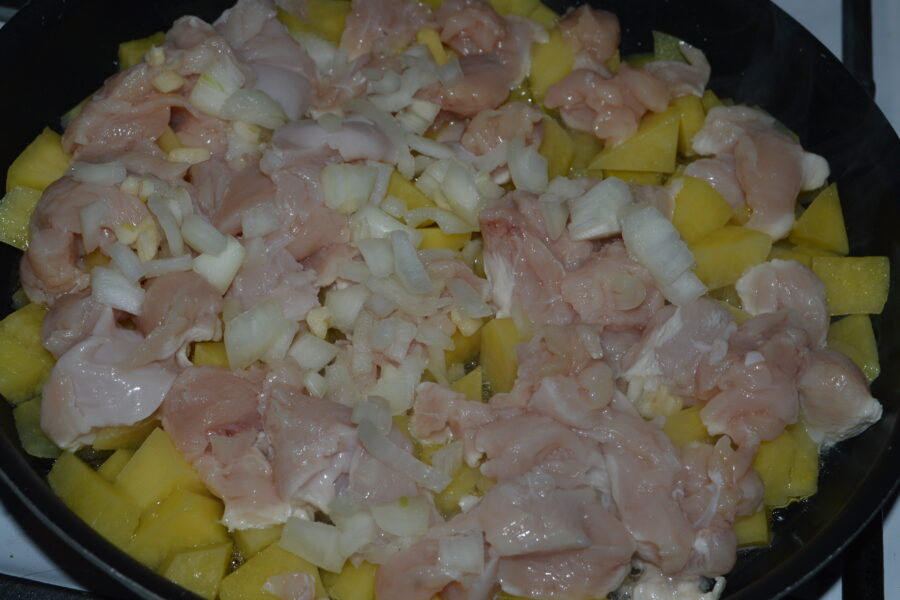 - Taiati pieptul de pui, ceapa si usturoiul. Adaugati in tigaie.