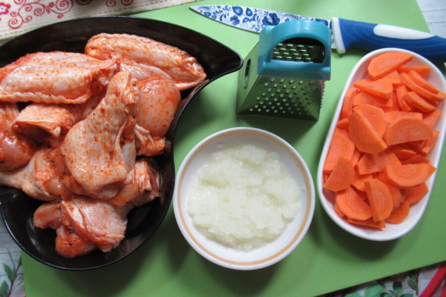 - În timp ce carnea de pui este înmuiată în condimente, pregătiți legumele. Tocați ceapa după dorință (preferăm să folosim un blender sau răzătoare pentru asta). Tăiați morcovii în inele subțiri.