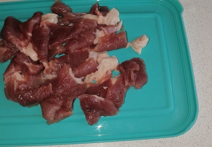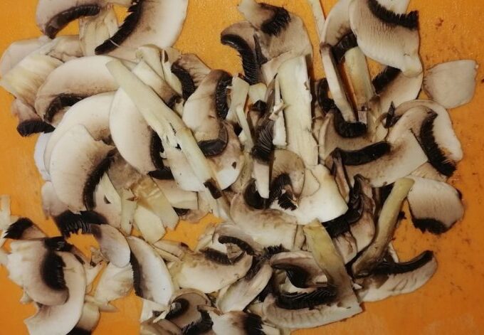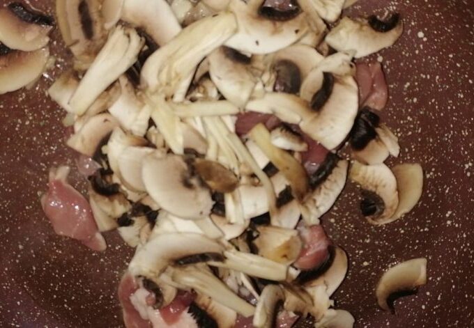- Se spală carnea, se taie în felii subțiri de orice formă. Se curăță ciupercile de coajă și se taie în felii