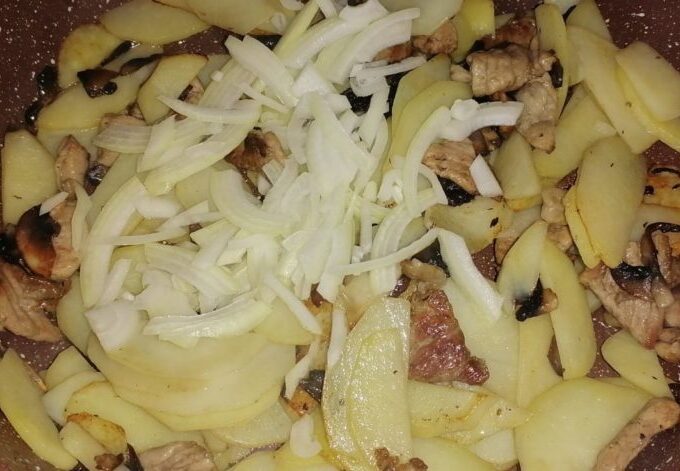 - Se curăță cartofii de coajă, se taie felii, se pun într-o tigaie și se prăjesc până sunt aproape fierți, aproximativ 7 minute.