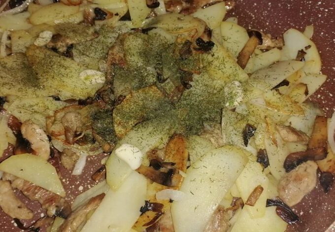 - Se adaugă ceapa tăiată felii, se prăjește până când toate produsele sunt gata. Apoi se adaugă usturoiul tăiat în bucăți de orice formă, mărarul, sarea și piperul.