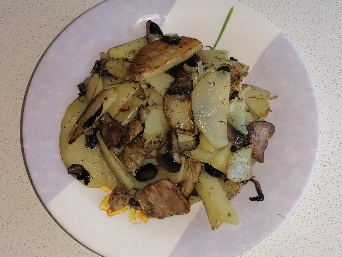 Cartofi prajiti cu carne, ciuperci si usturoi este o combinatie care rasfata papilele gustative cu savoare si textura. Usturoiul da personalitate, ciupercile aduc aroma umami, iar cartofii crocanti echilibreaza textura. Preparatul este gandit pentru cei care vor un fel plin, satios si apropiat de casa, fara retusuri. Potrivit pentru cine tarzii sau mese festive cand vrei gust intens si placere culinara. Aceasta mâncare simplă, dar foarte gustoasă, se prepară în doar 20-30 de minute. Rețeta este potrivită pentru o cină rapidă în familie, mai ales că puteți folosi chiar și carne congelată.